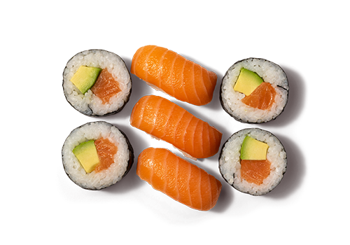 Sushi: 4x Futomaki mit Lachs und Avocado; 3x Nigiri mit Lachs.